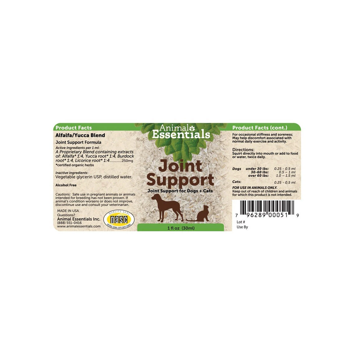 Animal Essentials Joint Support features certified organic herbs such as, alfalfa, licorice root, and yucca root to provide joint support and promote comfort for dogs and cats. Yucca root, licorice root, and alfalfa for dogs and cats are known to support healthy joints and enhance the function of glucosamine, chondroitin and other mobility compounds. This herbal formula also features burdock root extracts to support a healthy liver function.