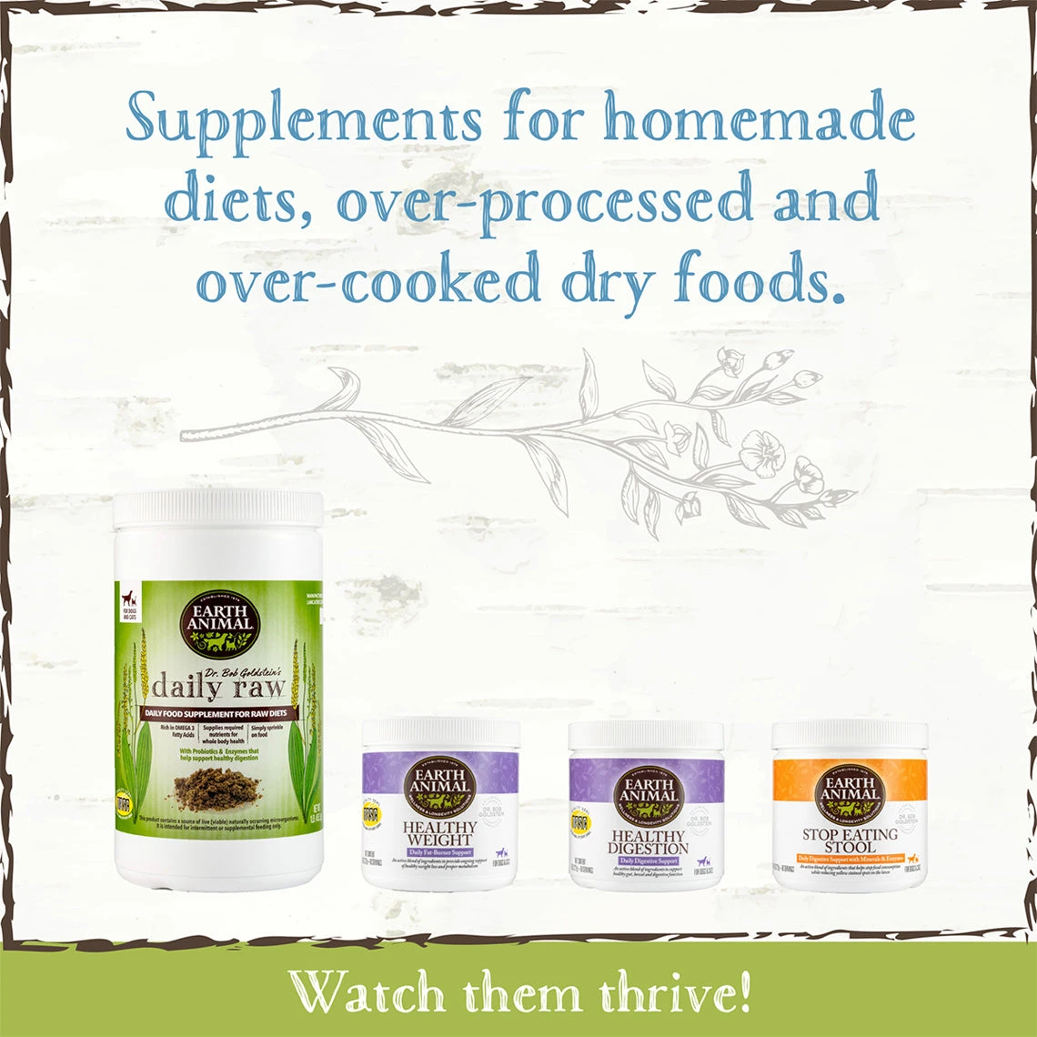 Earth Animal Daily Raw Food Nutritional Supplement Powder is an all-in-one multivitamin plus mineral supplement to add to raw food diets. It contains essential fatty acids, vitamins, minerals, digestive enzymes, probiotics, & high levels of Vitamin E that will give the nutrients necessary when feeding raw food. Dr. Bob Goldstein formulated this well rounded supplement with his 40 years of veterinary experience.Â
