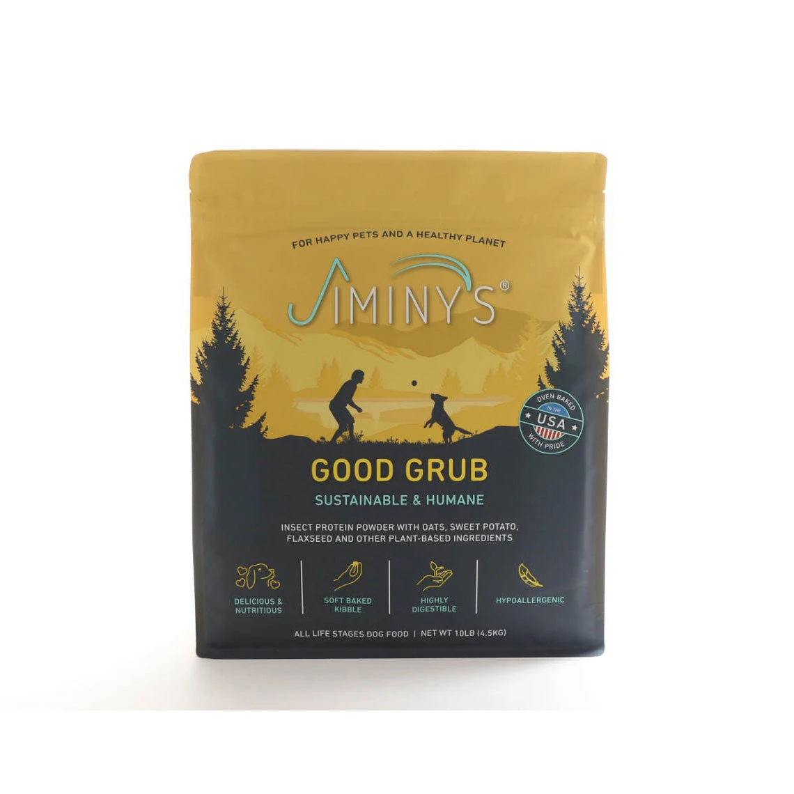 Jiminy’s Good Grub Dog Food is an earth-friendly kibble that utilizes Black Solider Fly larvae or Grubs combined with plant-based ingredients and turns them into a complete and balanced diet.