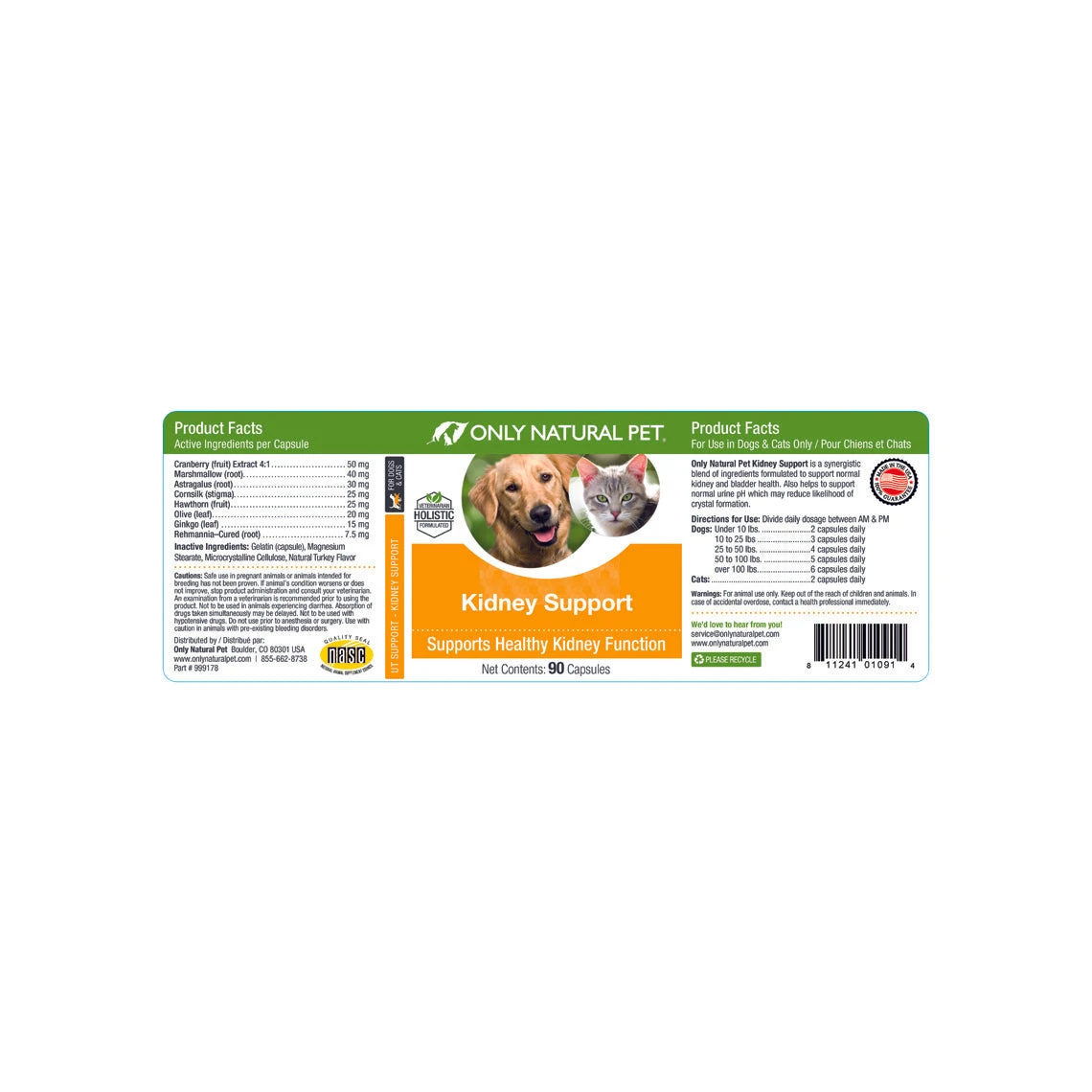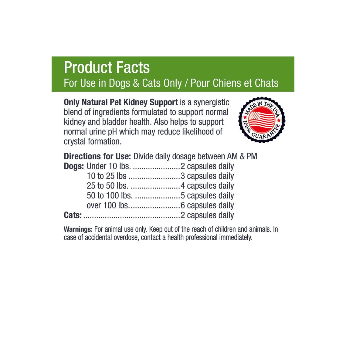 Only Natural Pet Kidney Support is the perfect supplement for supporting the health of your pet’s entire urinary system and is appropriate for adult pets. Our pets’ kidneys can be damaged by ingesting toxins or medications, through genetic factors, and quite commonly due to infectious invaders like bacteria. Effects of this damage can be seen in many organs, including the bladder and urinary tract, where clear evidence may appear as recurrent infections, and in the form of urine crystals or kidney stones.