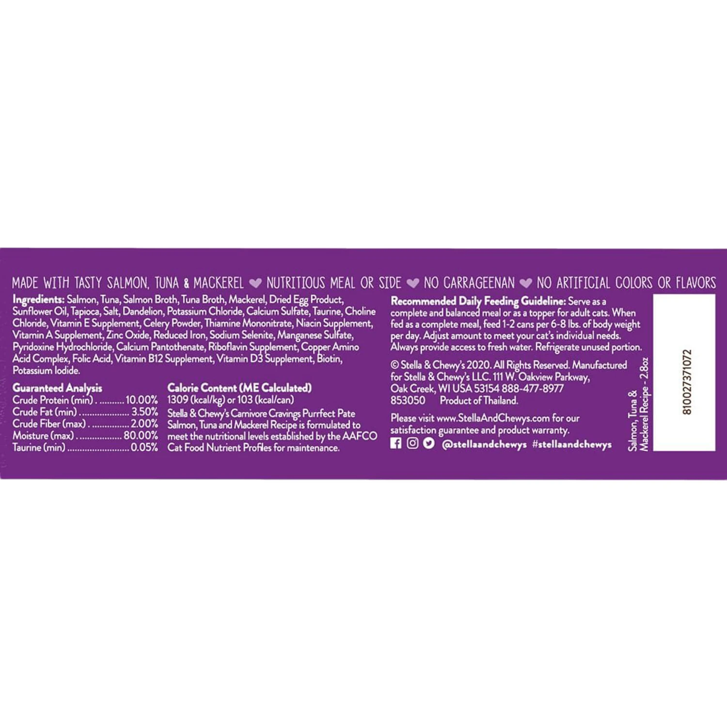 Stella and Chewy’s Carnivore Cravings Purrfect Pate Salmon, Tuna and Mackerel Wet Cat Food is a smooth pate in a tasty salmon broth. Approved by picky cats, this wet cat food is rich in animal protein and low in carbs with added taurine to support overall heart health.