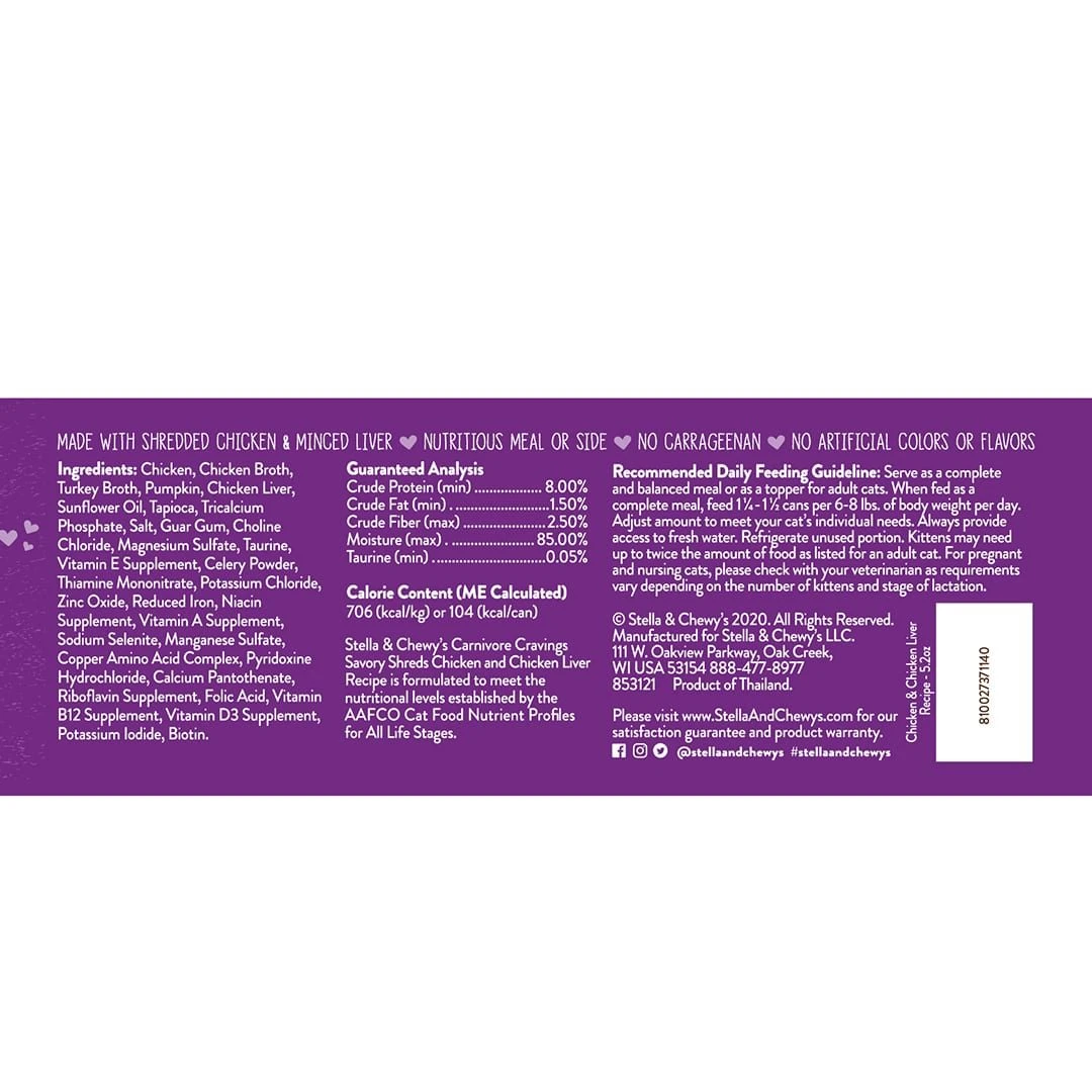 Stella and Chewy’s Carnivore Cravings Savory Shreds Chicken and Chicken Liver Wet Cat Food is a shredded cat food in a light meaty broth, crating a great texture that your cat is sure to love. This wet cat food also has bits of pumpkin to help with your cats digestion.